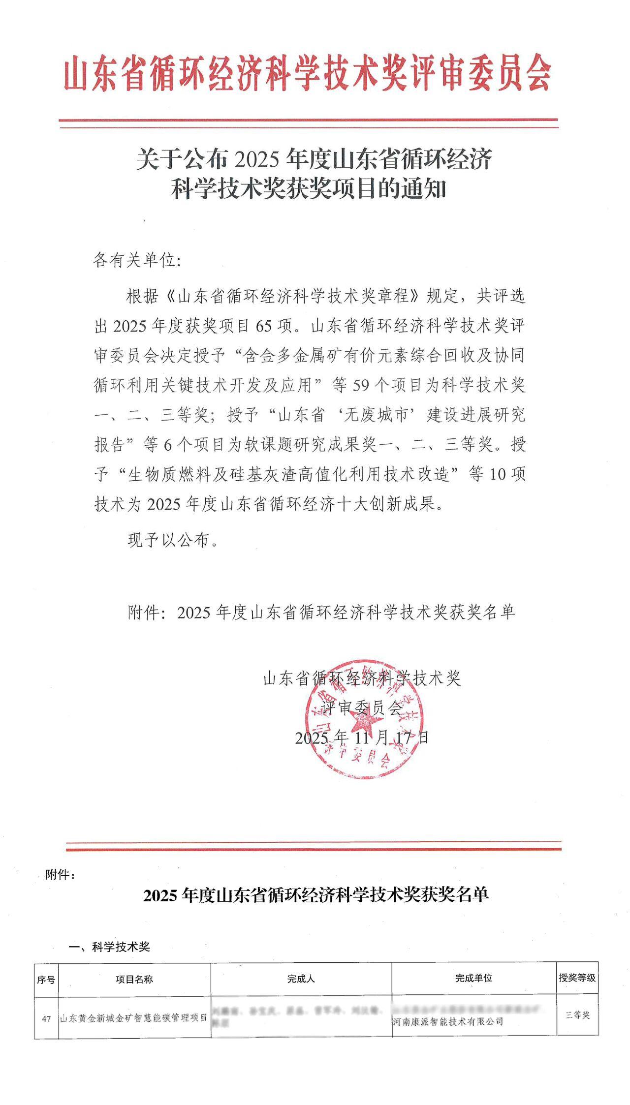 近日,2025 年度山东省循环经济科学技术奖获奖结果正式公布,河南康派智能技术有限公司申报的 “山东黄金新城金矿智慧能碳管理项目” 凭借突出的创新实践与绿色成效,成功荣获科学技术奖三等奖!